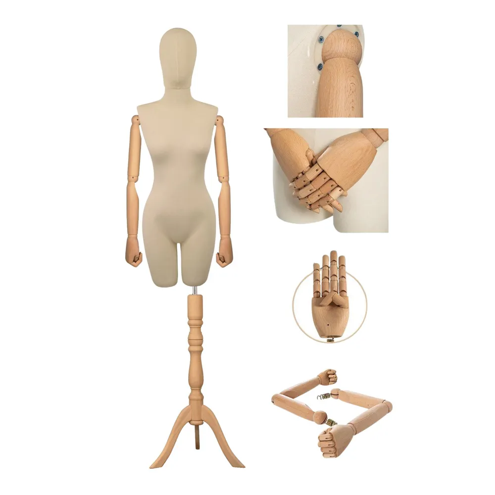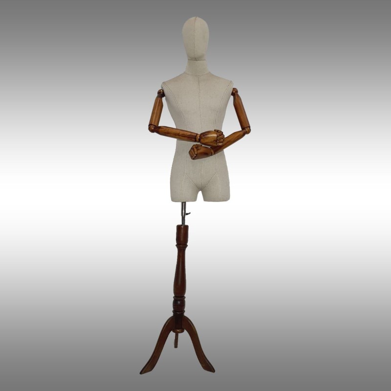 Мъжки и дамски манекени с подвижни дървени ръце и торс с крака, на дървена стойка. Възможност за коригиране на височината.
